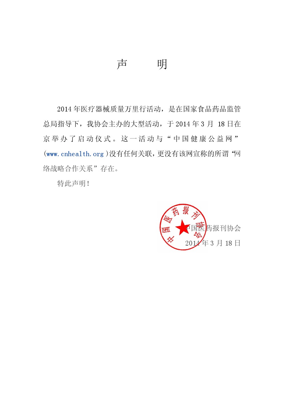 2014年医疗器械质量万里行活动,是在国家食品药品监管总局指导下,中国医药报刊协会主办的大型活动,于2014年3月 18日在京举办了启动仪式。这一活动与“中国健康公益网”(www.cnhealth.org )没有任何关联,中国医药报刊协会更没有与该网宣称的所谓“网络战略合作关系”存在。