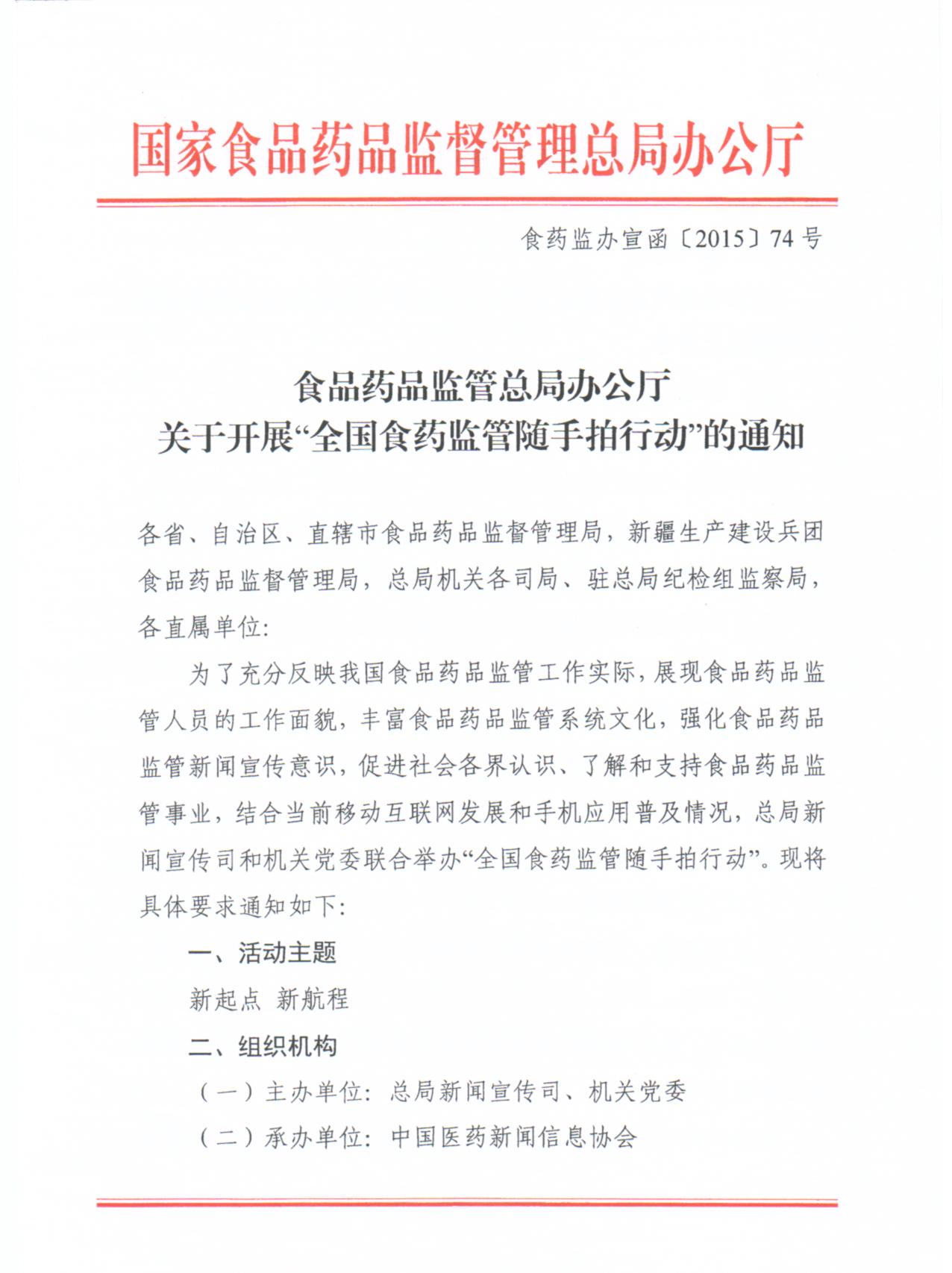 日前,国家食品药品监督管理总局办公厅发出通知,“全国食药监管随手拍行动”正式启动。这一活动由中国医药新闻信息协会独家承办。